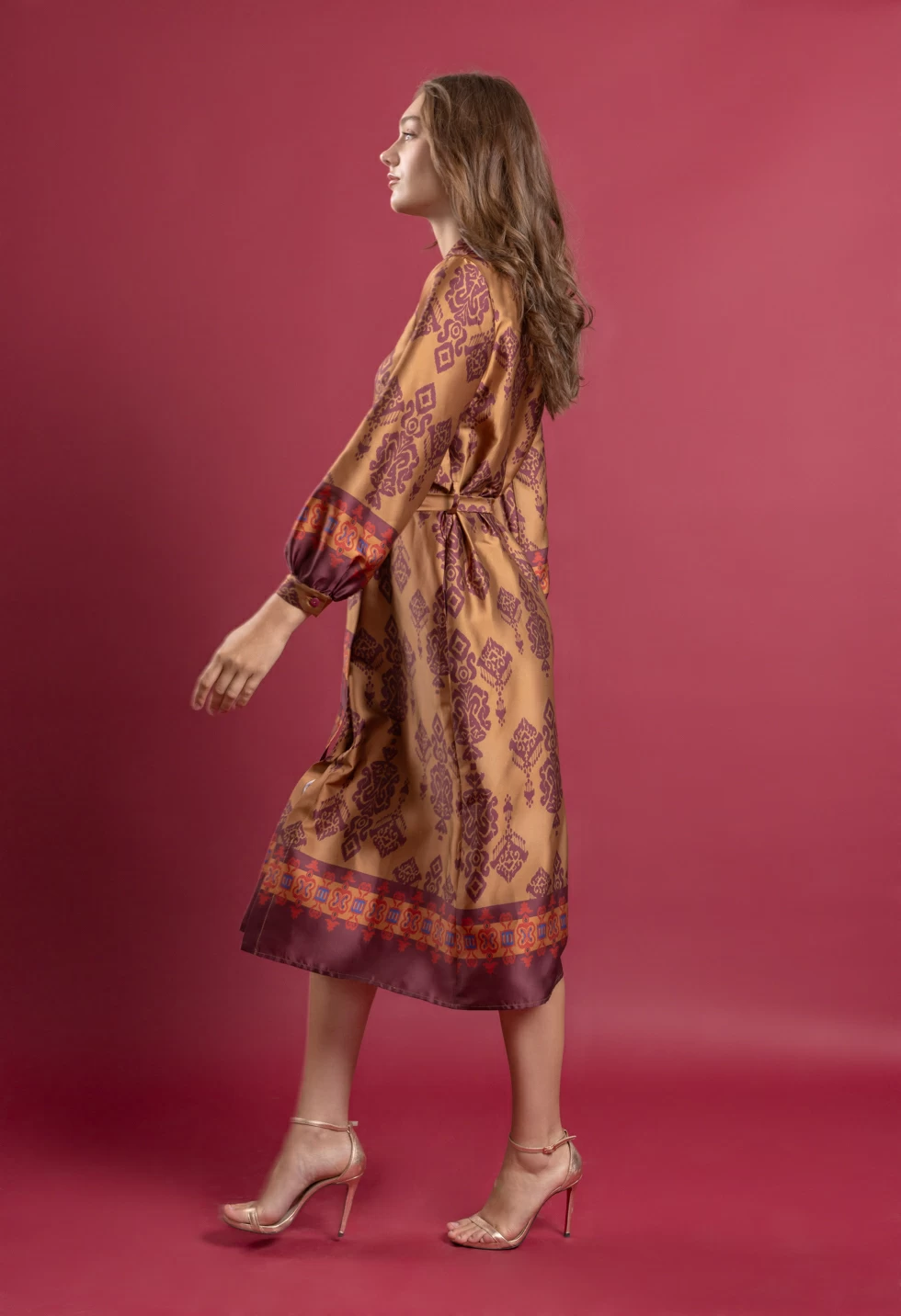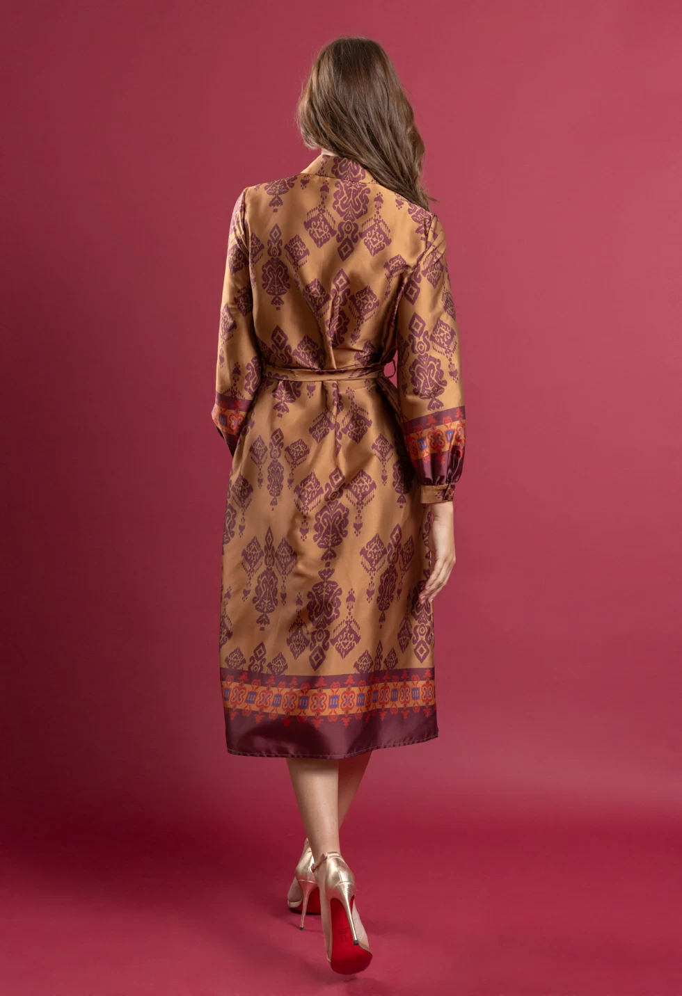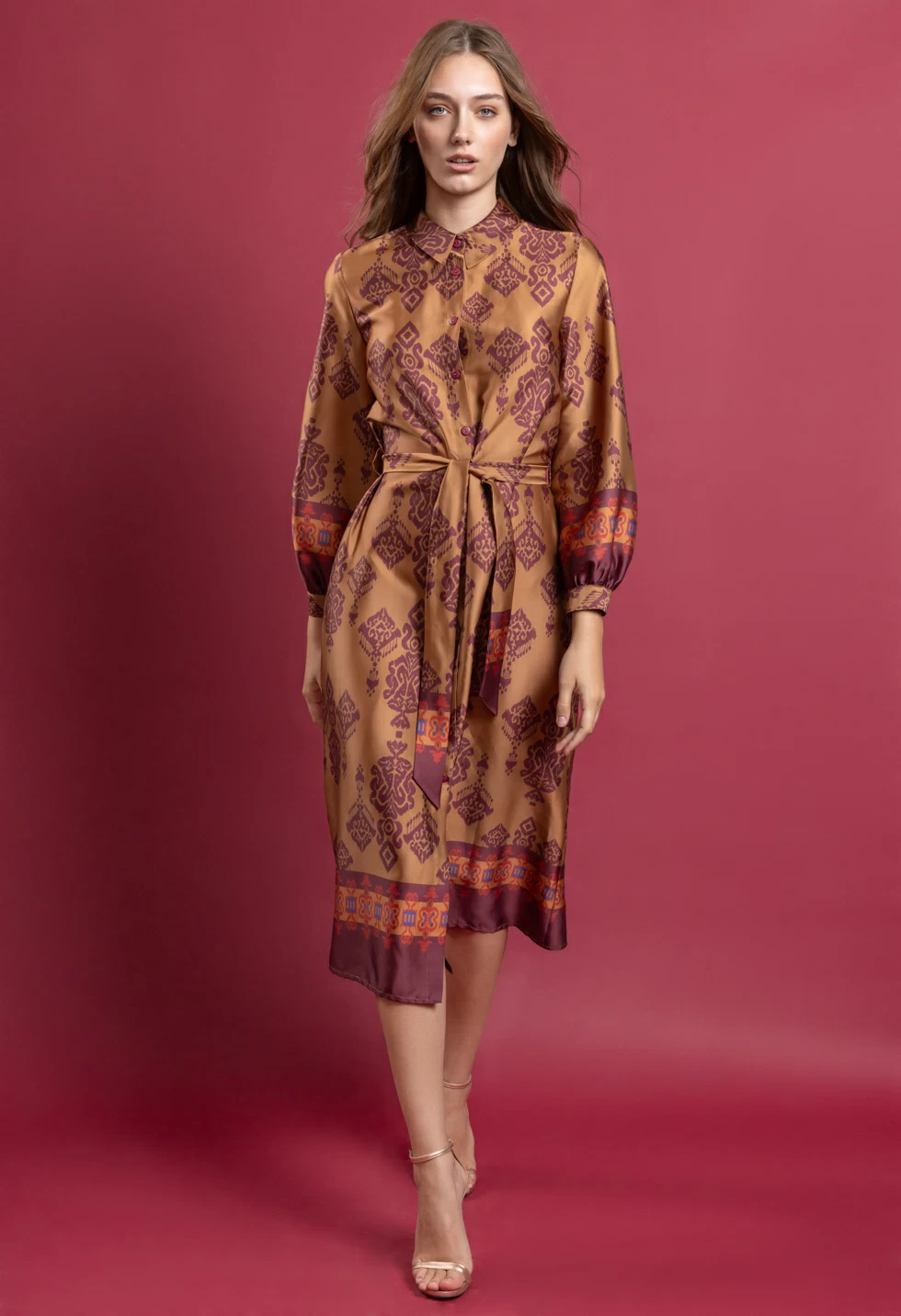 Φόρεμα με γιακά και μακρύ μανίκι που καταλήγει σε μανσέτα, σατινέ ύφασμα με εμπριμέ τύπωμα, κλείσιμο μπροστά με κουμπιά και ζώνη από το ίδιο ύφασμα, χαλαρή εφαρμογή.