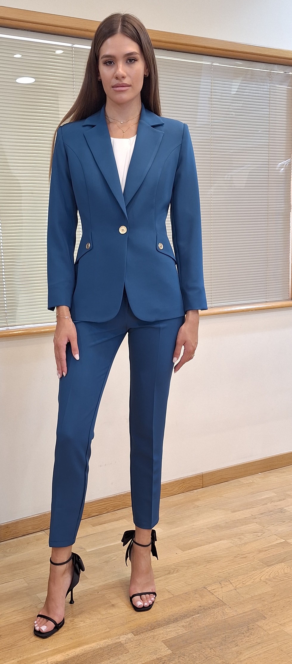 Μπλέιζερ με γιακά με πέτο και μακριά, μανίκια με βάτες, μπροστινές τσέπες, κλείσιμο μπροστά με κουμπιά, κανονική εφαρμογή ψηλόμεσο παντελόνι με τονισμένη τσάκιση μπροστά και θηλιές, κλείσιμο μπροστά με φερμουάρ και κουμπί.